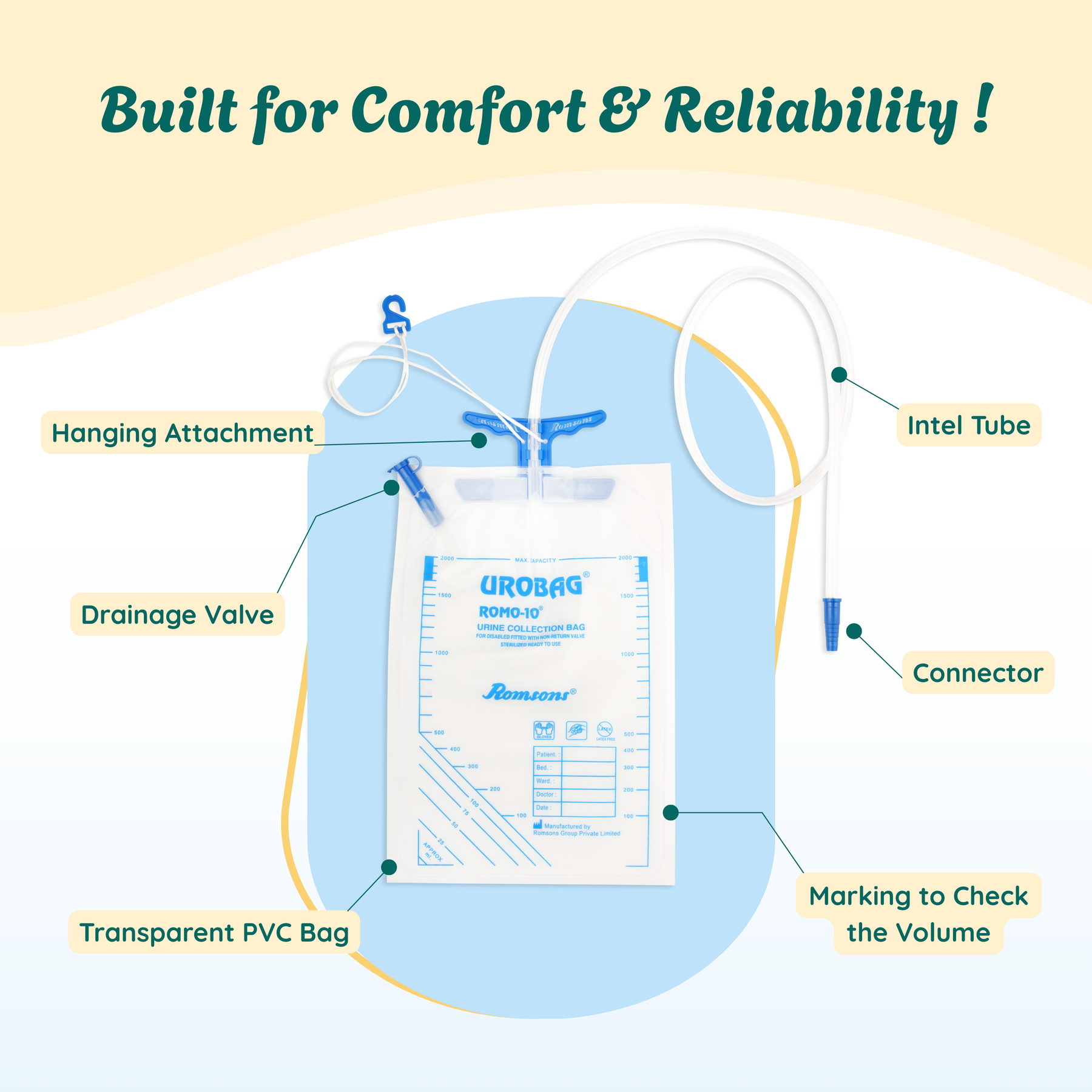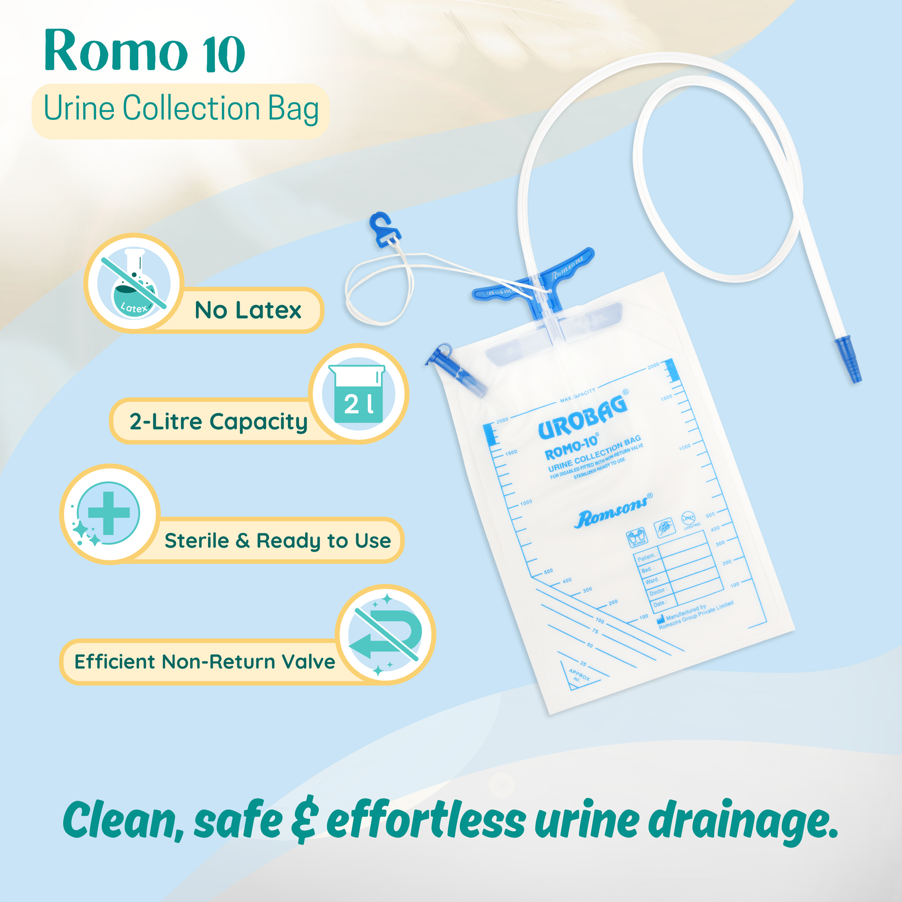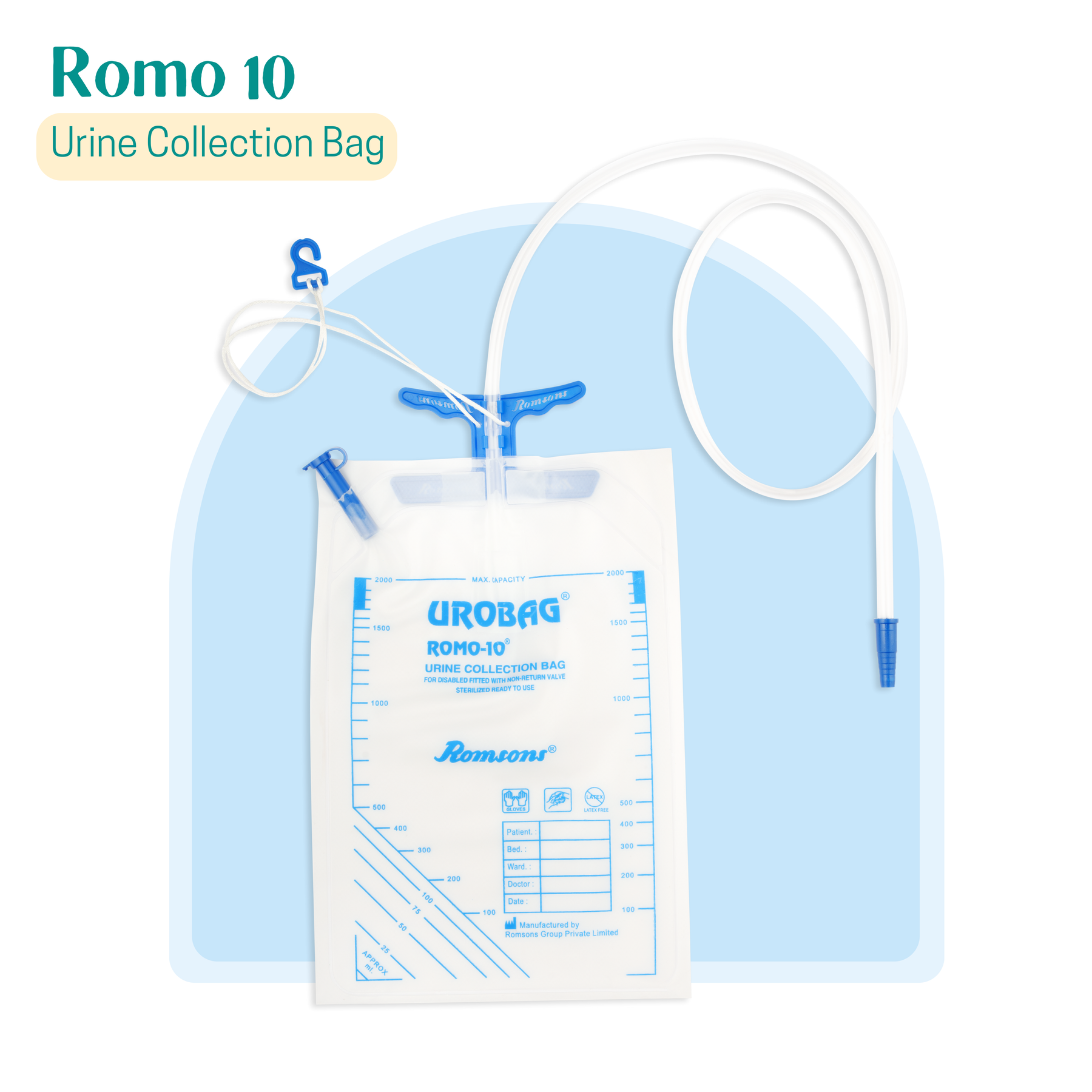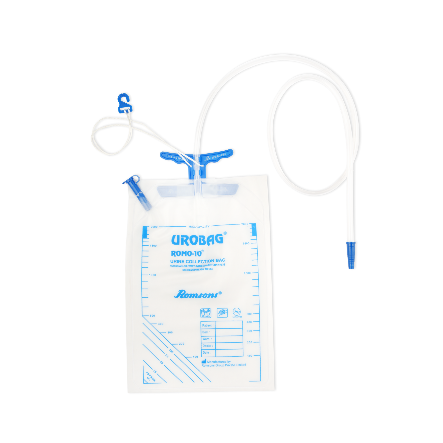 - The Romsons Romo 10 Urine Urobag has a capacity of 2 litre and is provided with a 100 cm long super smooth kink resistant tubing to ensure unrestricted flow