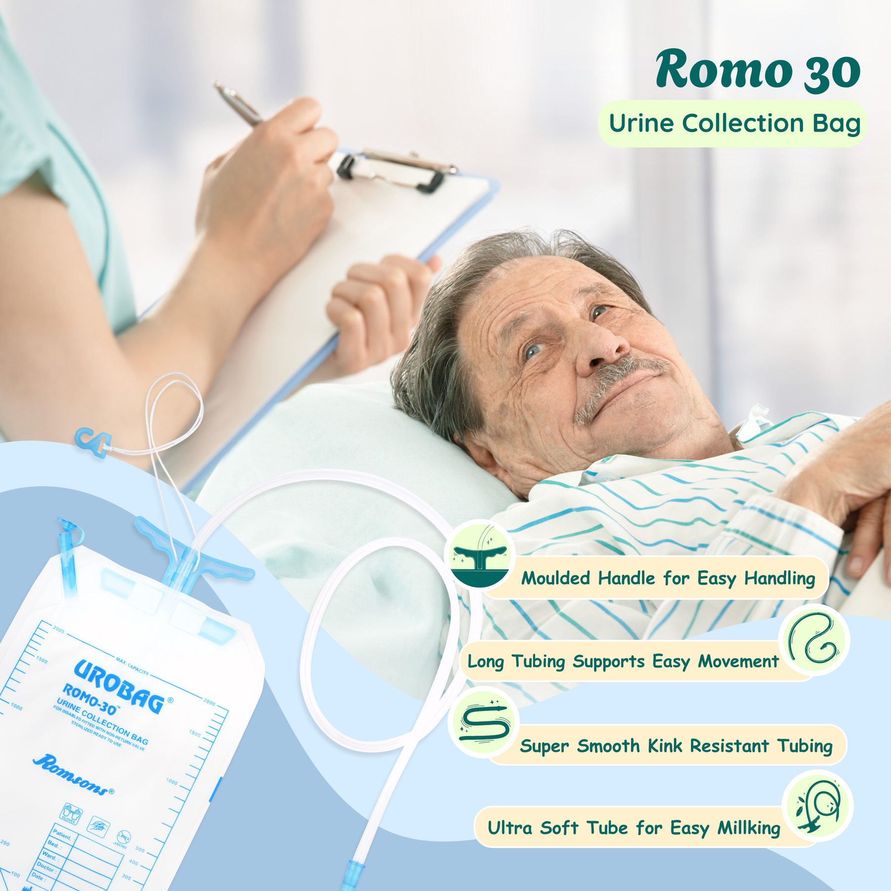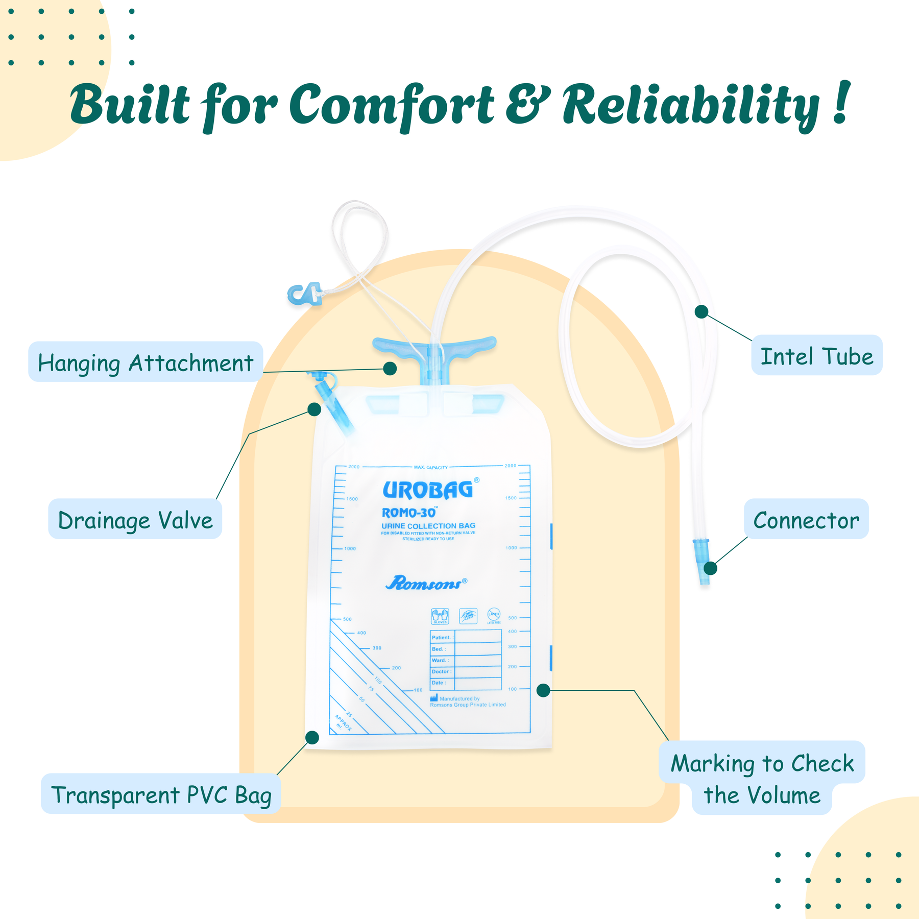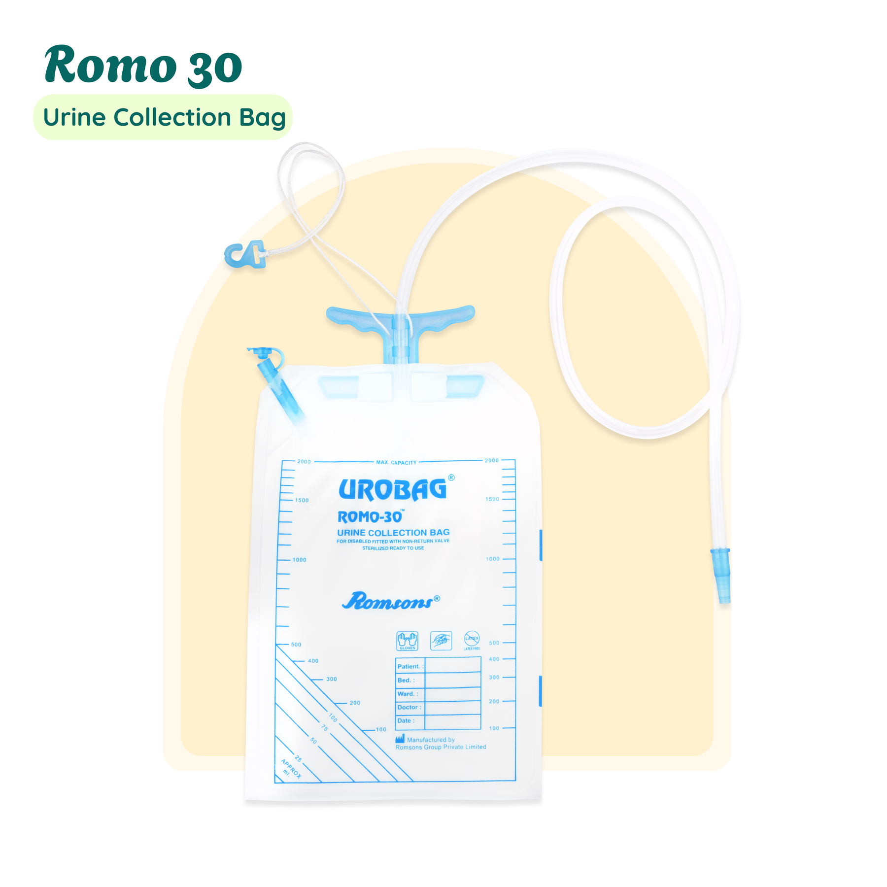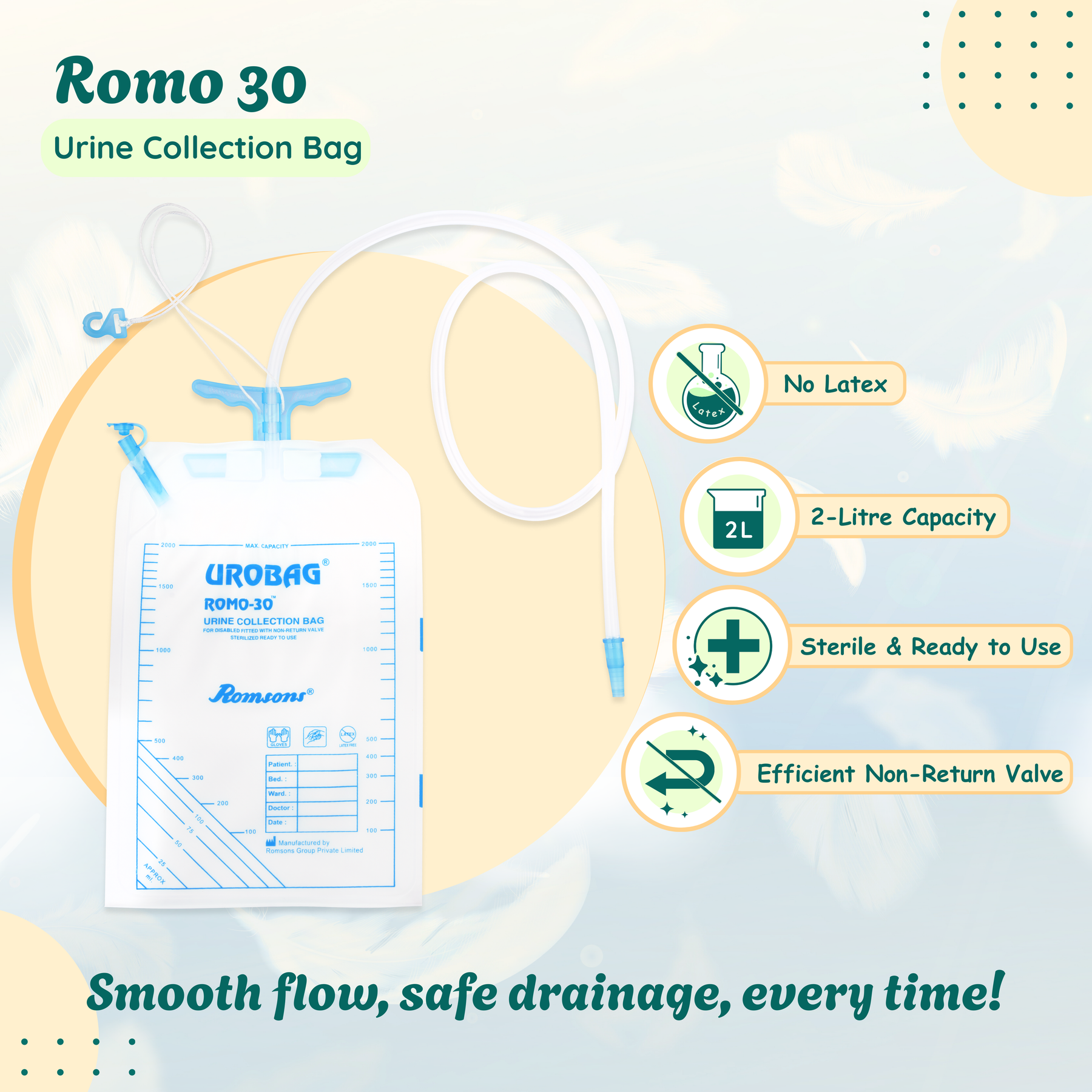 - The Romsons Romo 30 Urine Urobag has a capacity of 2 litre and is provided with a 100 cm long super smooth kink resistant tubing to ensure unrestricted flow