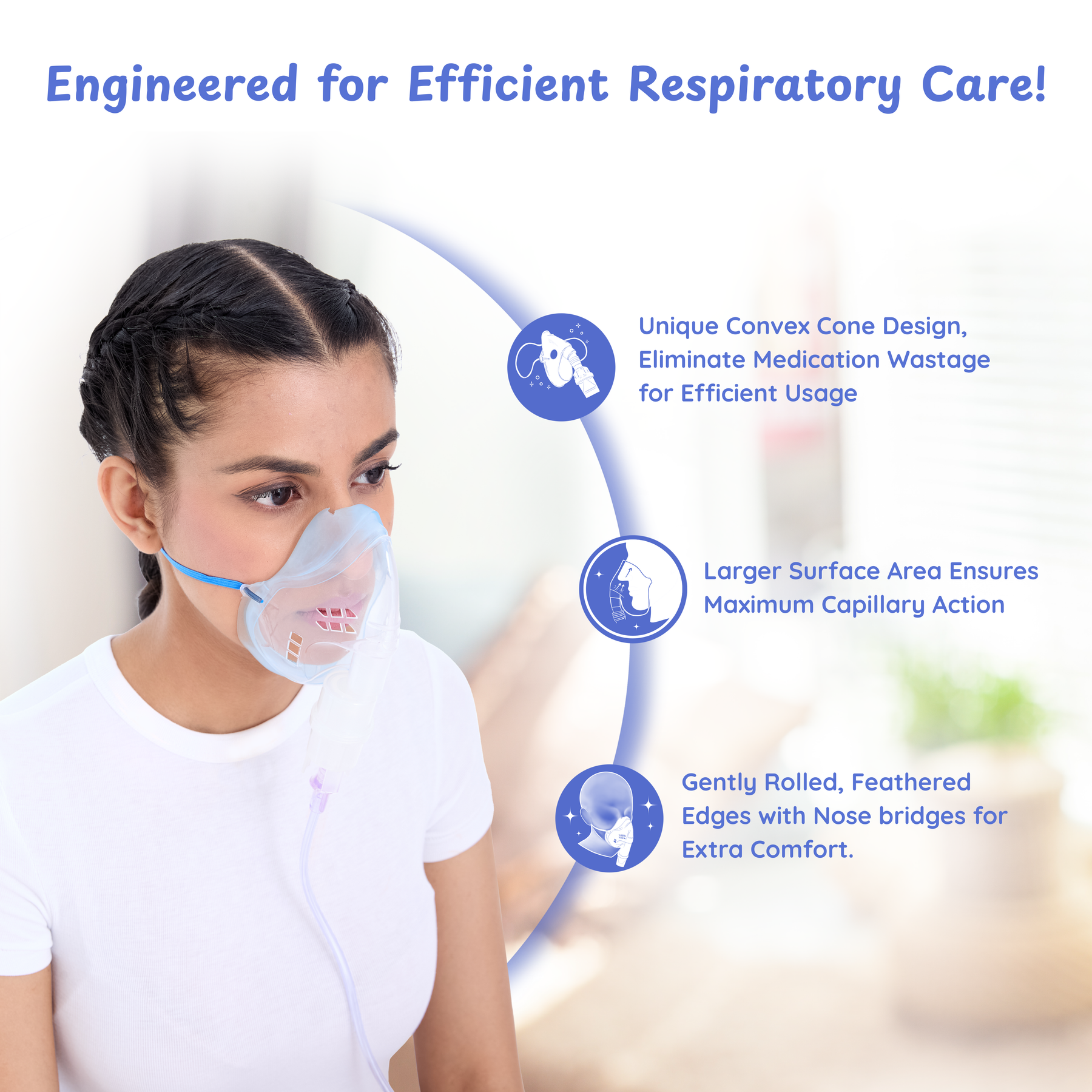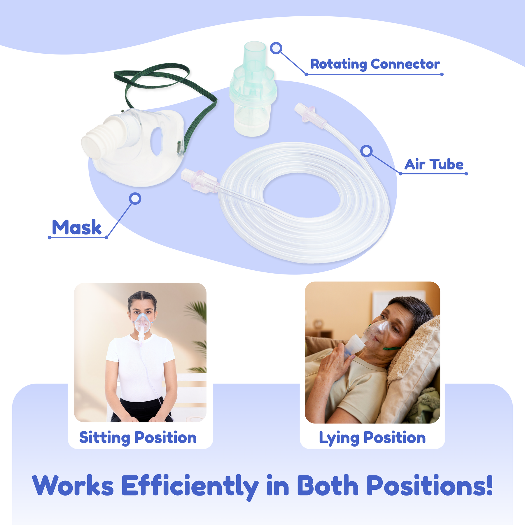 - Nebulizes 3 cc within 10 minutes in horizontal or vertical position ensuring patient comfort.