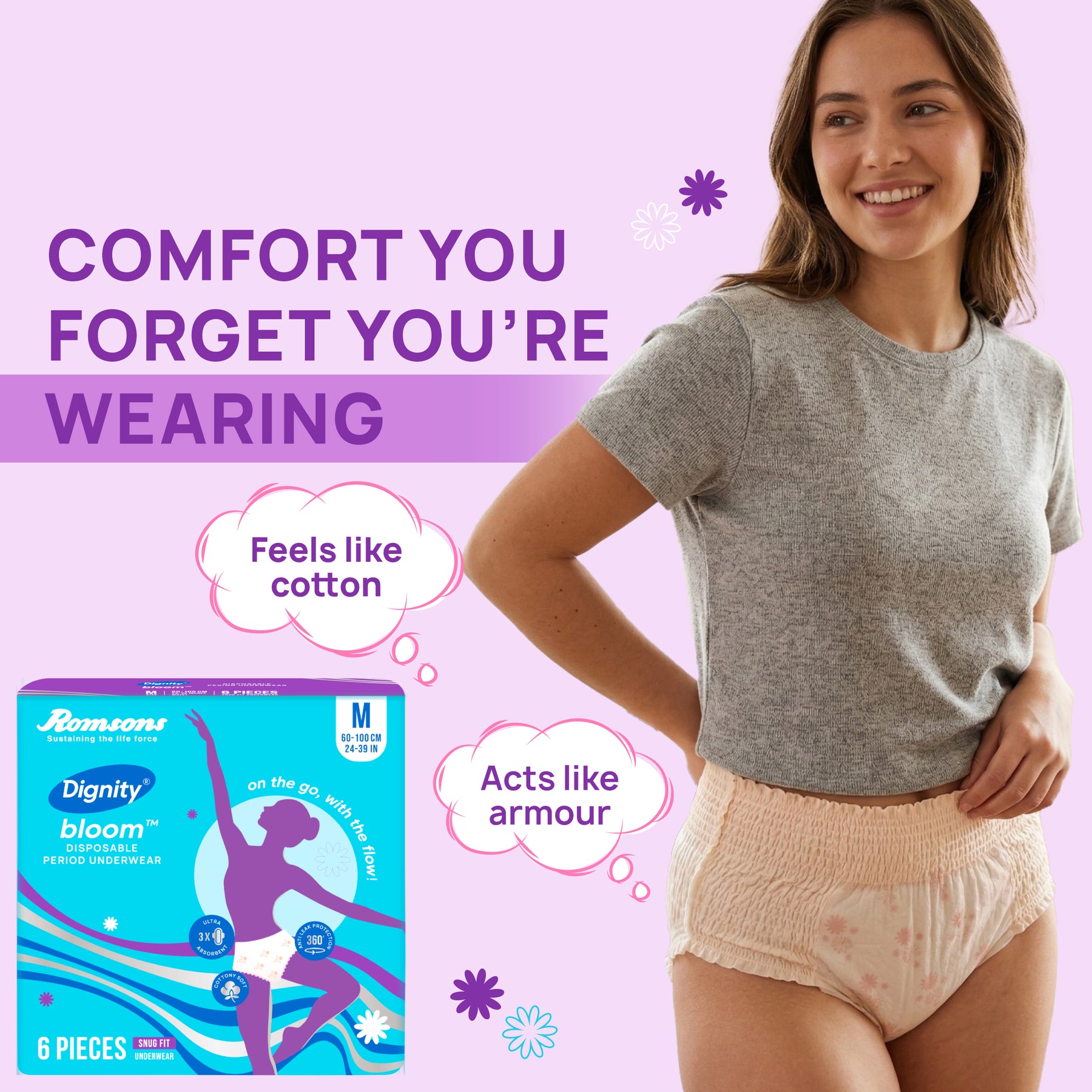Dignity Bloom Disposable Period Underwear, designed to keep you feeling fresh, fearless, and free. Engineered with 360° Anti-Leak Protection, these stretchable undies are your secret weapon against leaks, stains, and stress.