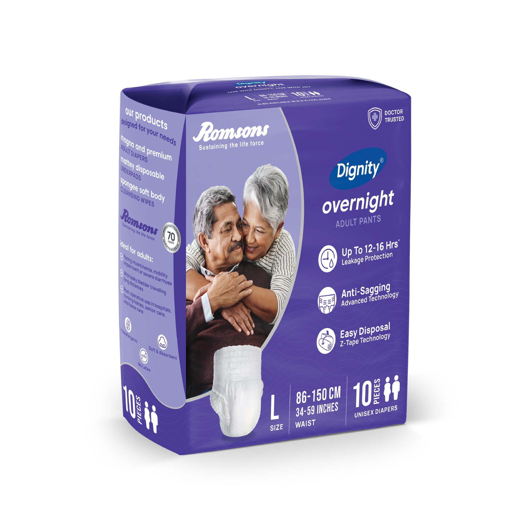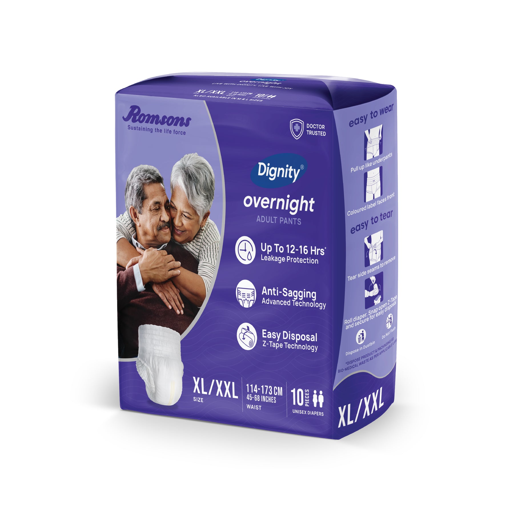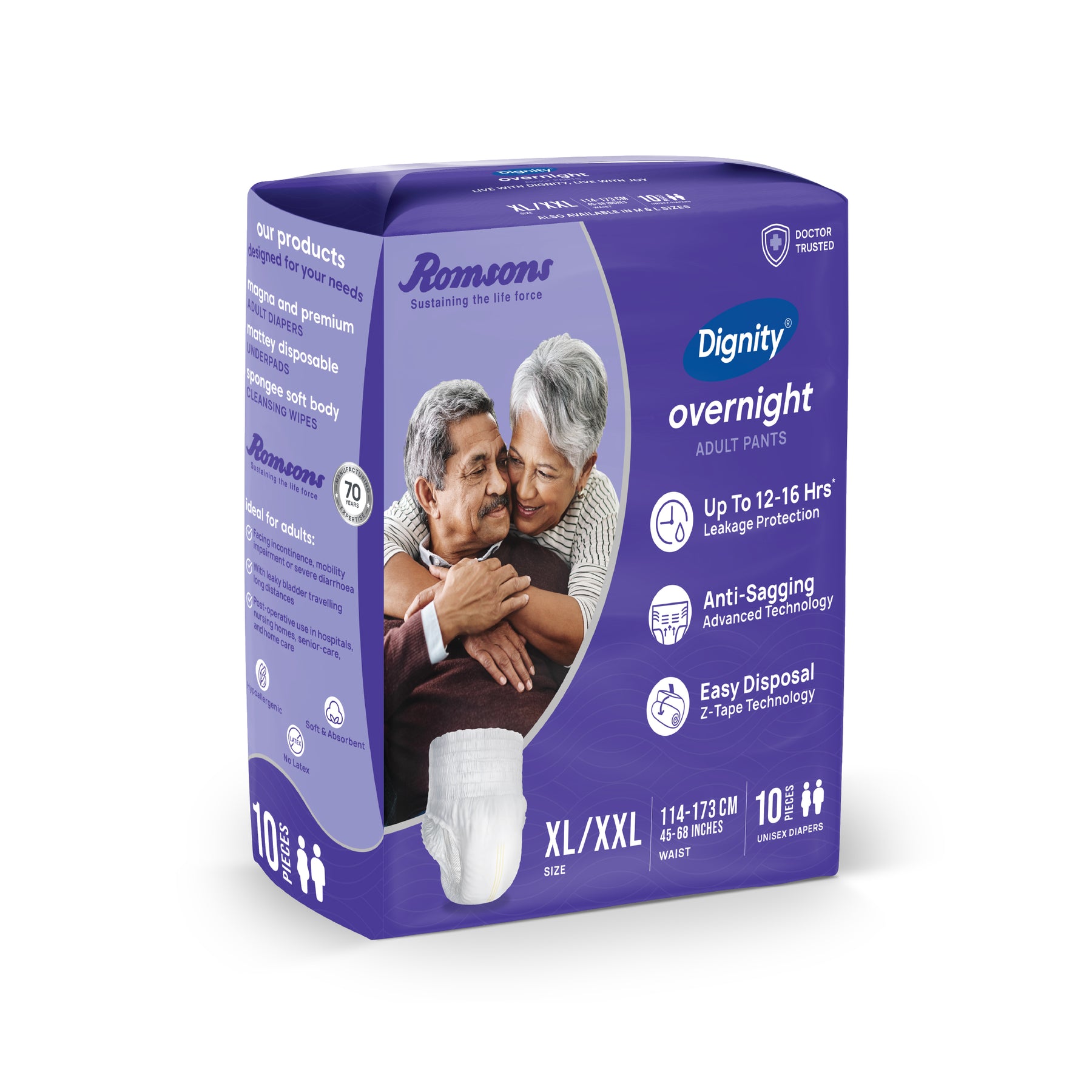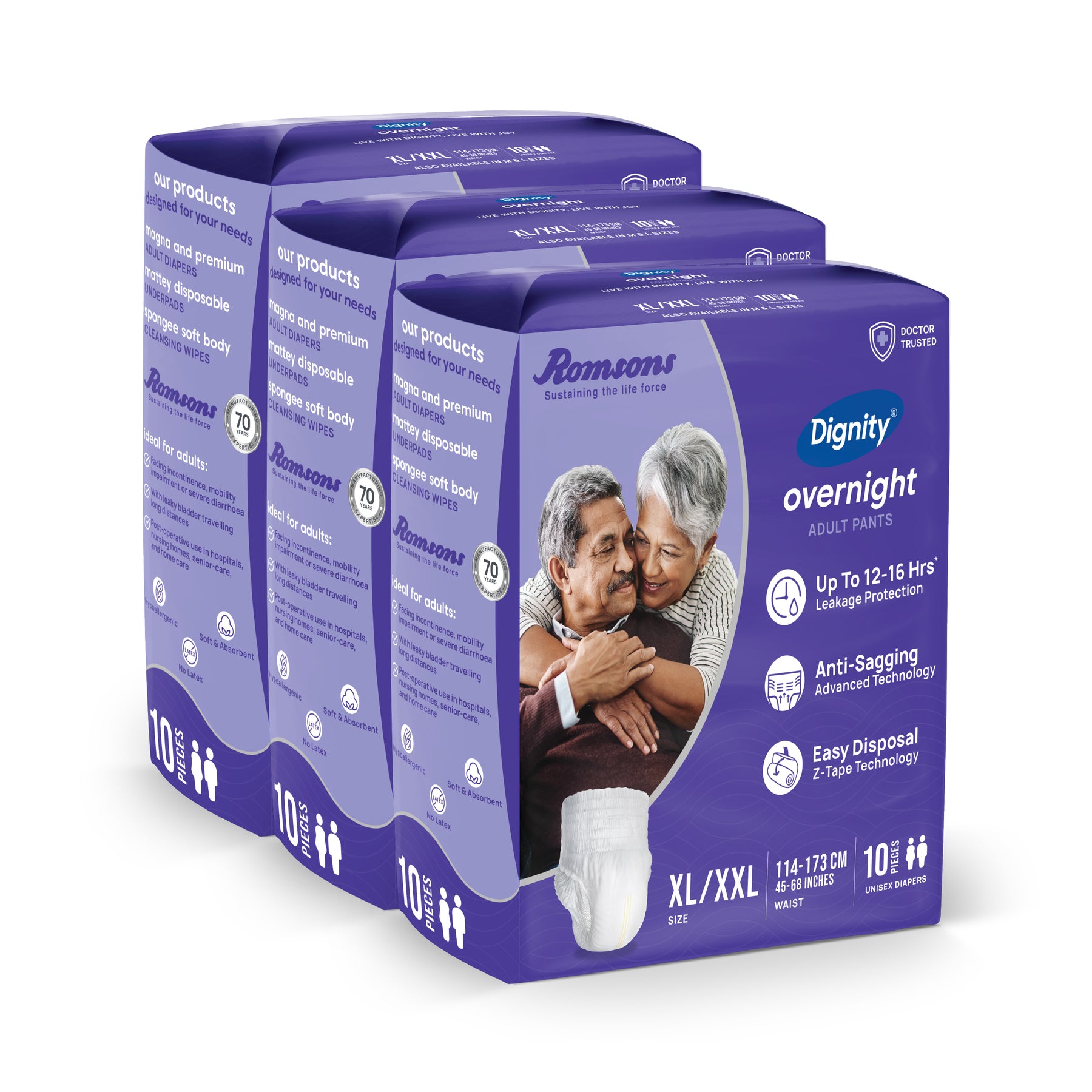 Dignity Overnight Pull-Ups are pants style adult diapers with a Leakage Protection Promise for up to 12-16 Hours. Easy to wear and take off, our Overnight Pull-Ups are designed for both men & women suffering from urinary or bowel leakage.