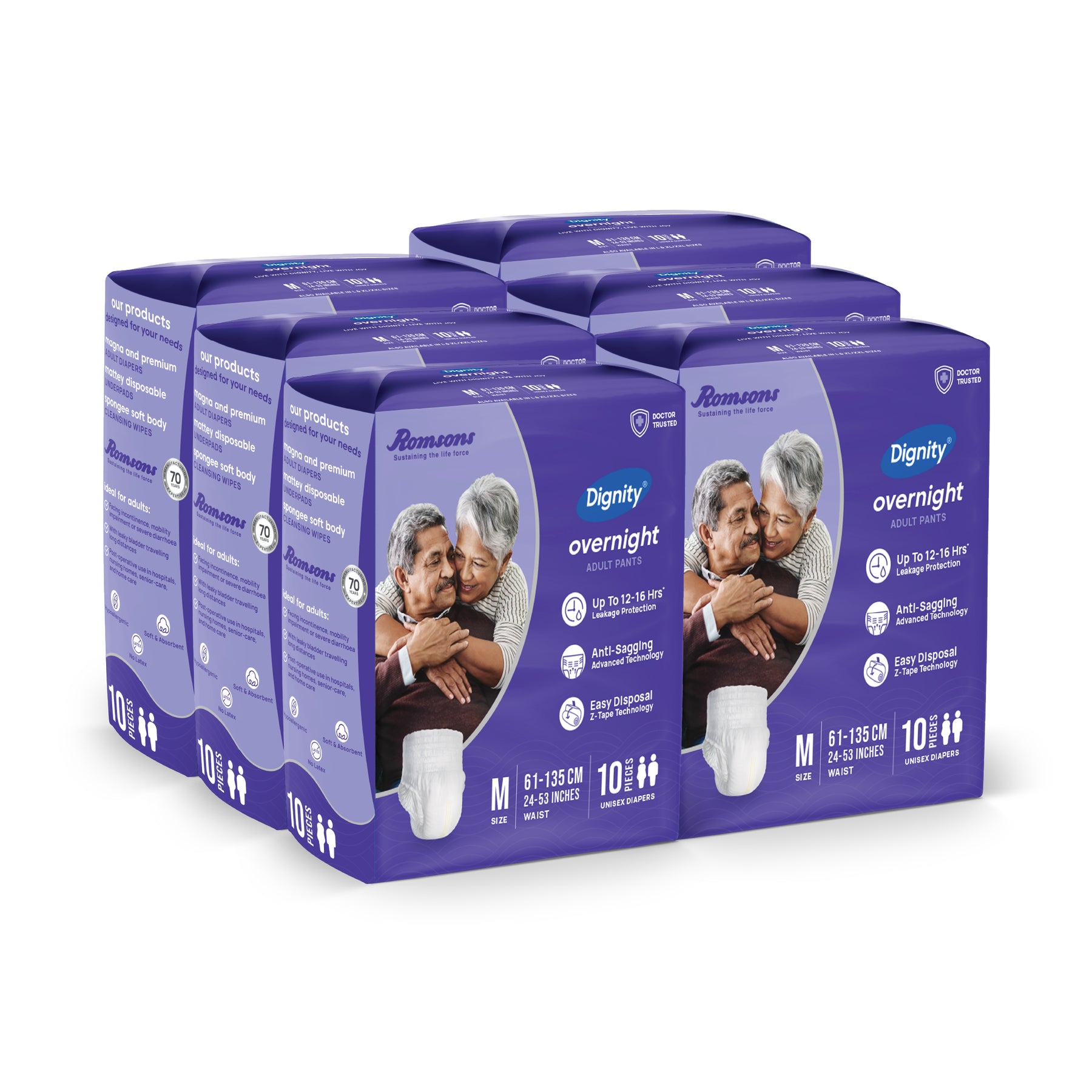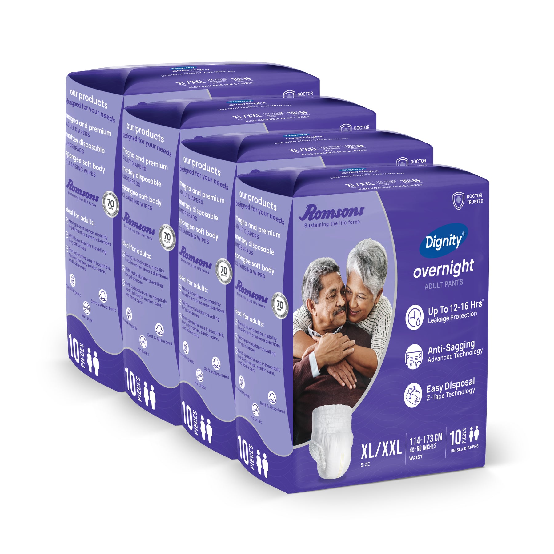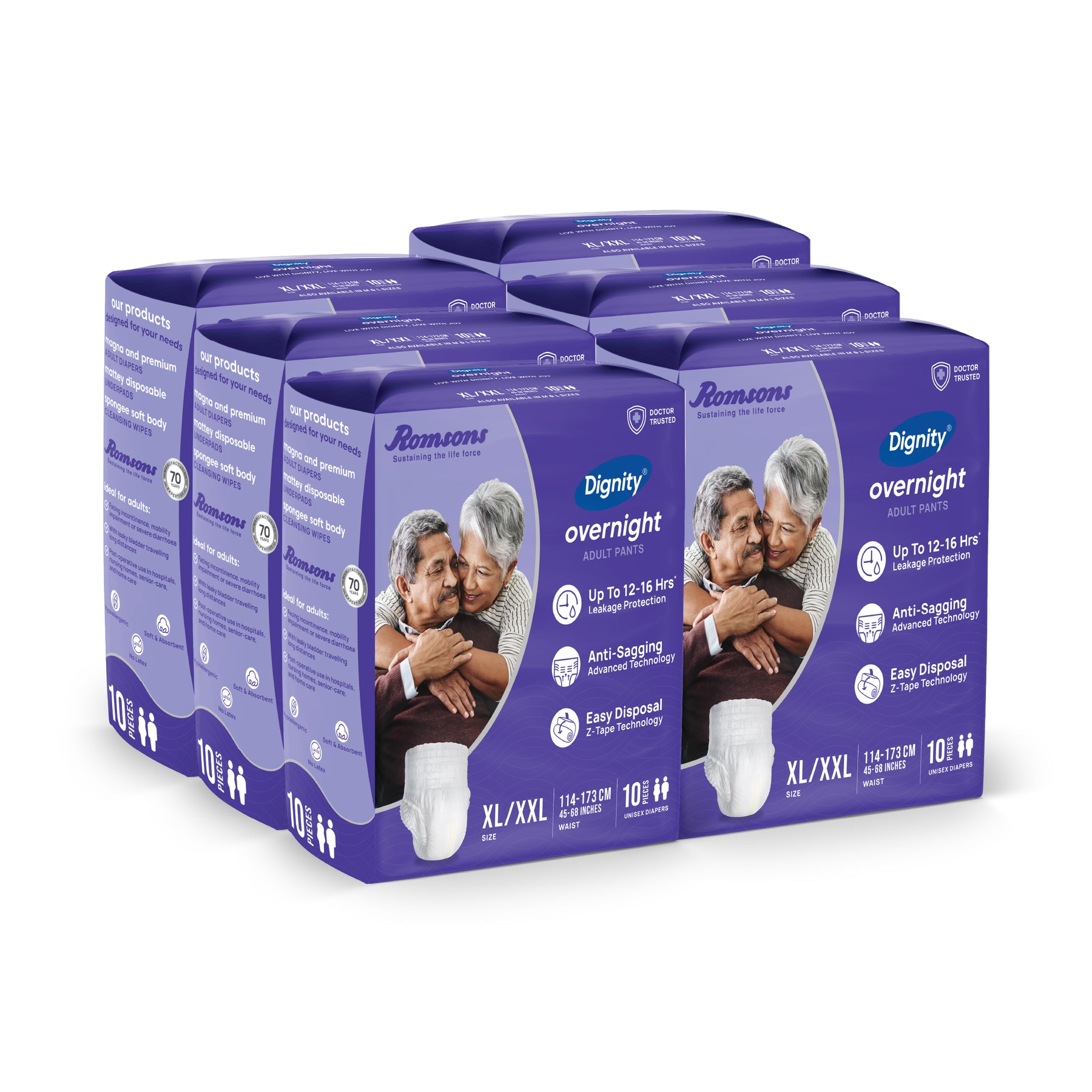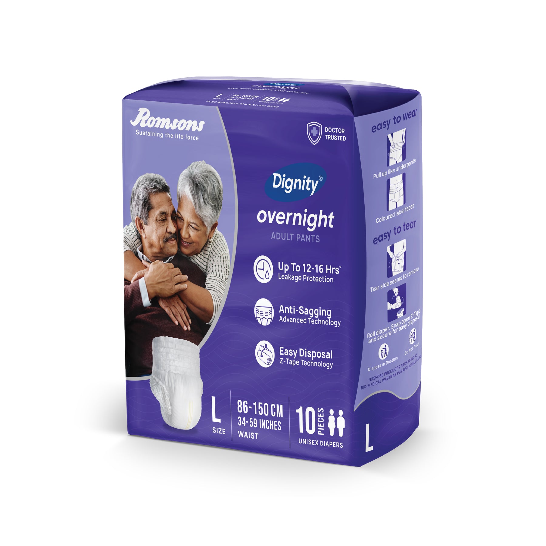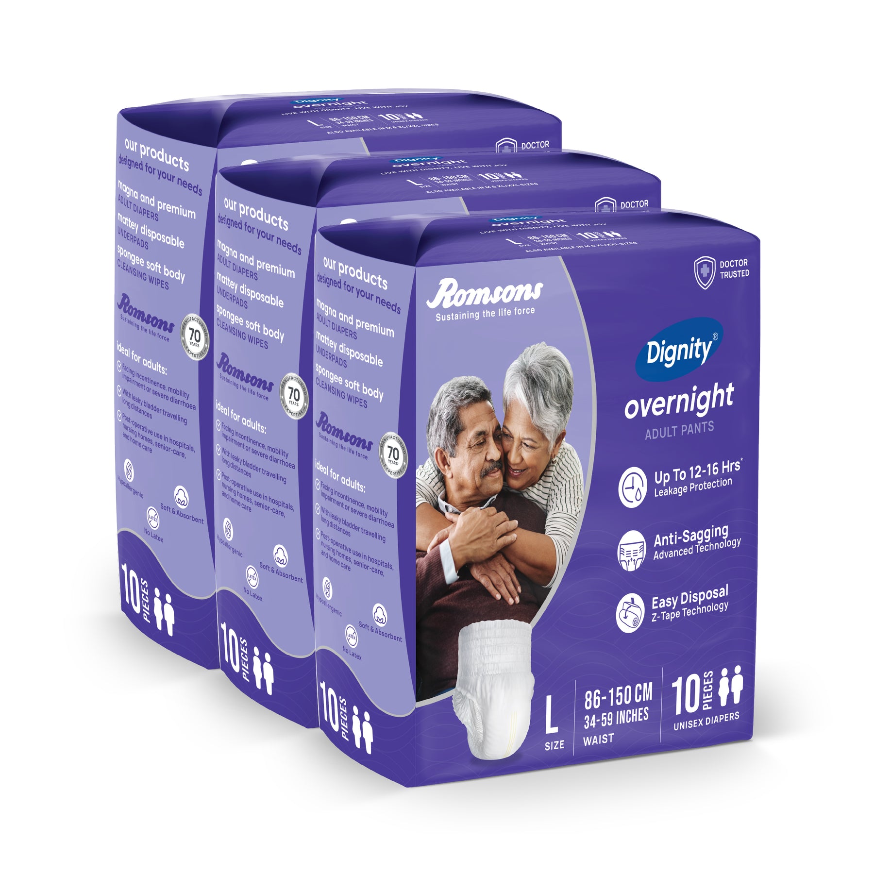 Dignity Overnight Pull-Ups are pants style adult diapers with a Leakage Protection Promise for up to 12-16 Hours. Easy to wear and take off, our Overnight Pull-Ups are designed for both men & women suffering from urinary or bowel leakage.