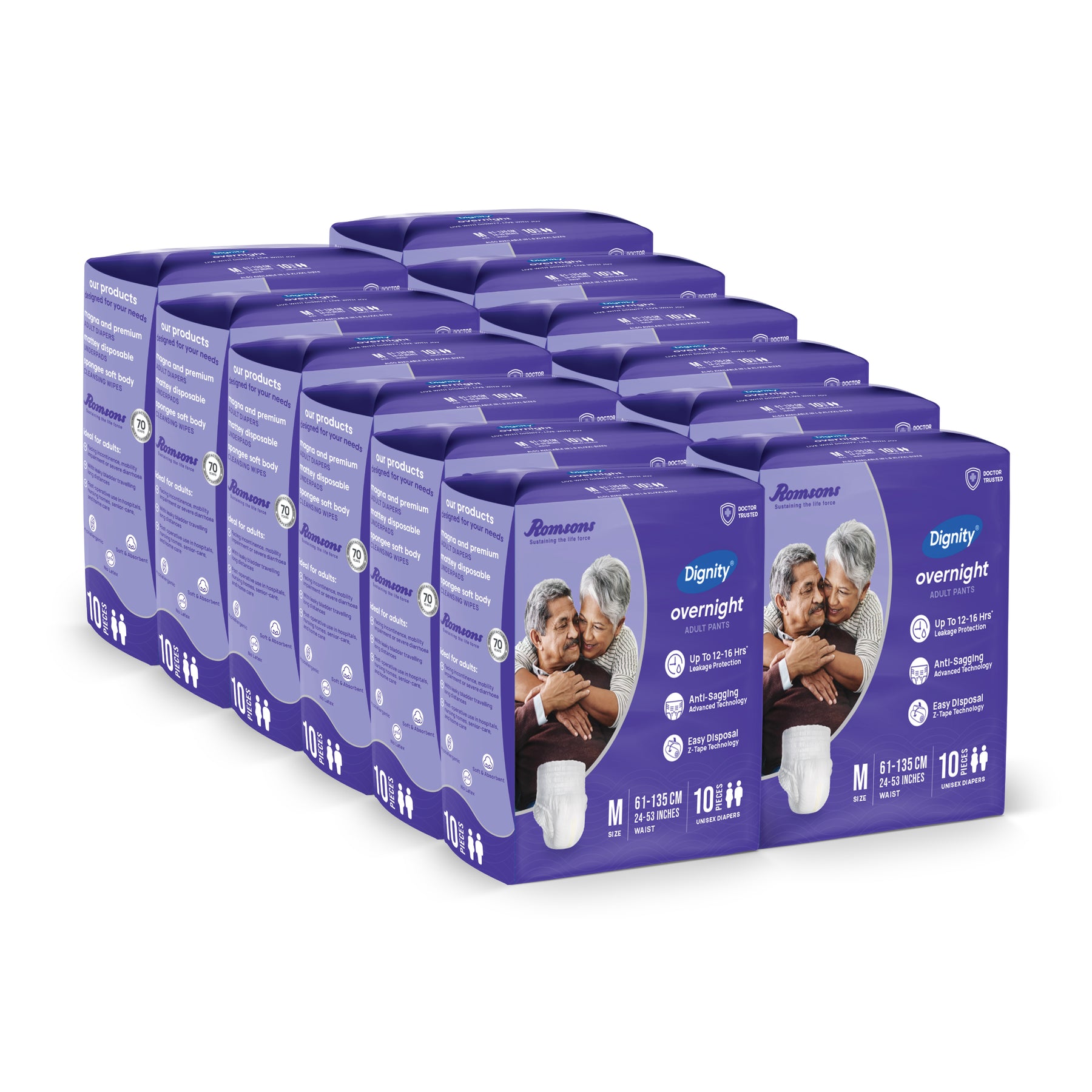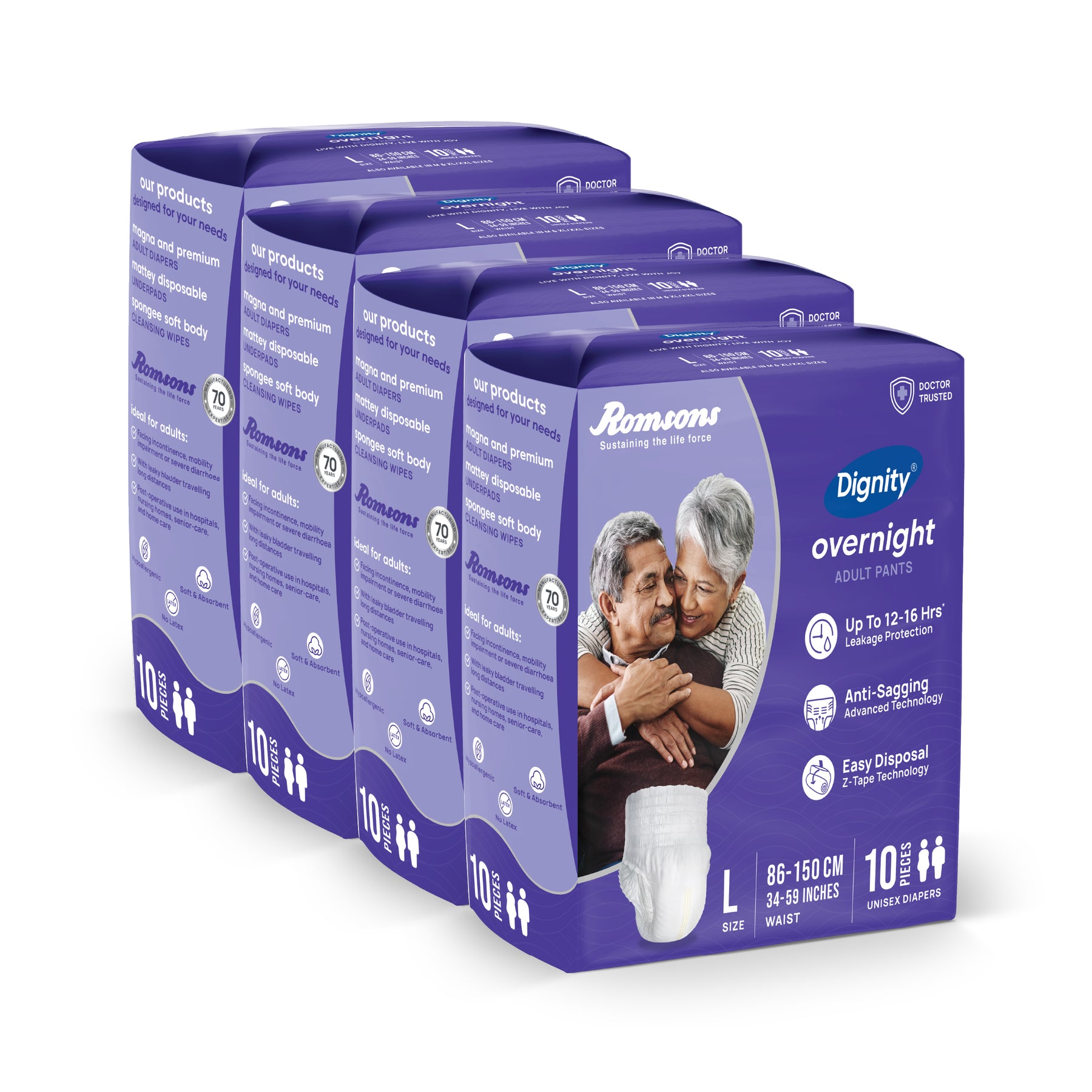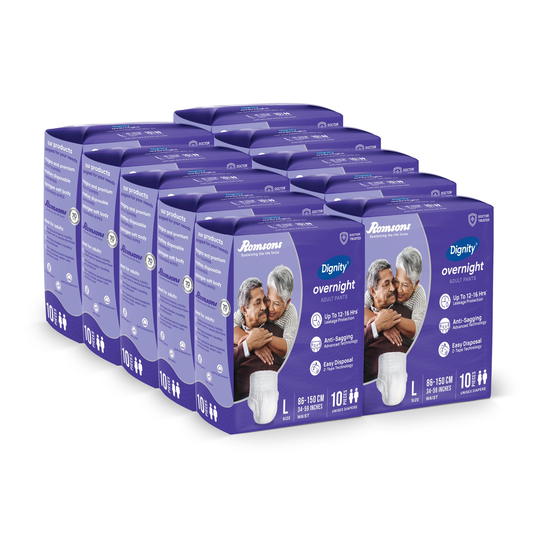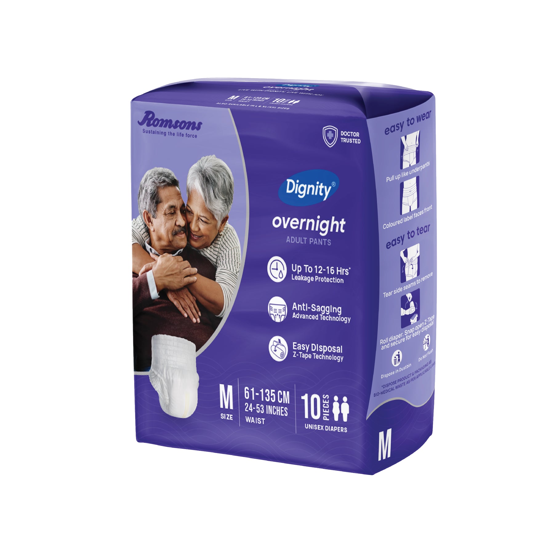Dignity Overnight Pull-Ups are pants style adult diapers with a Leakage Protection Promise for up to 12-16 Hours. Easy to wear and take off, our Overnight Pull-Ups are designed for both men & women suffering from urinary or bowel leakage.