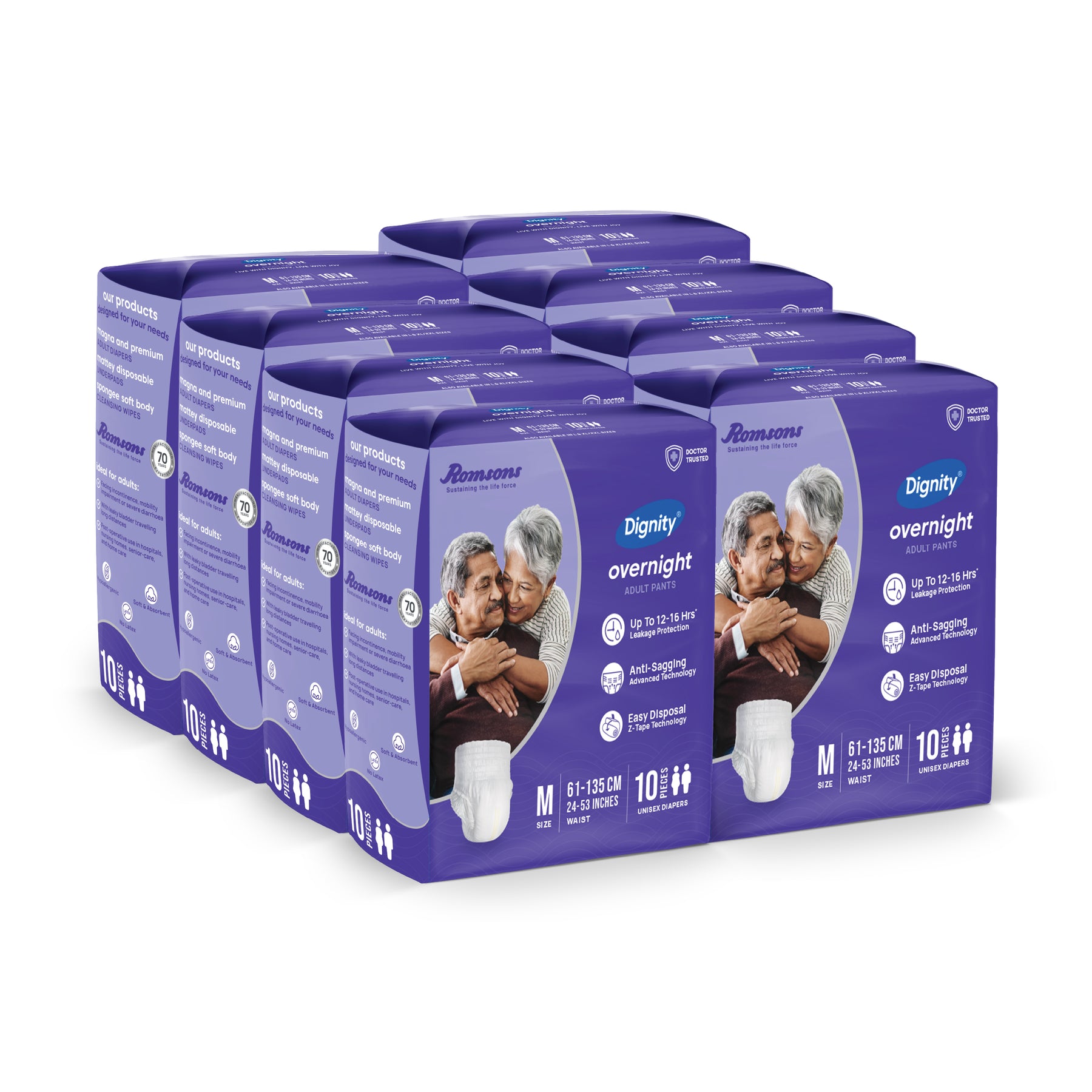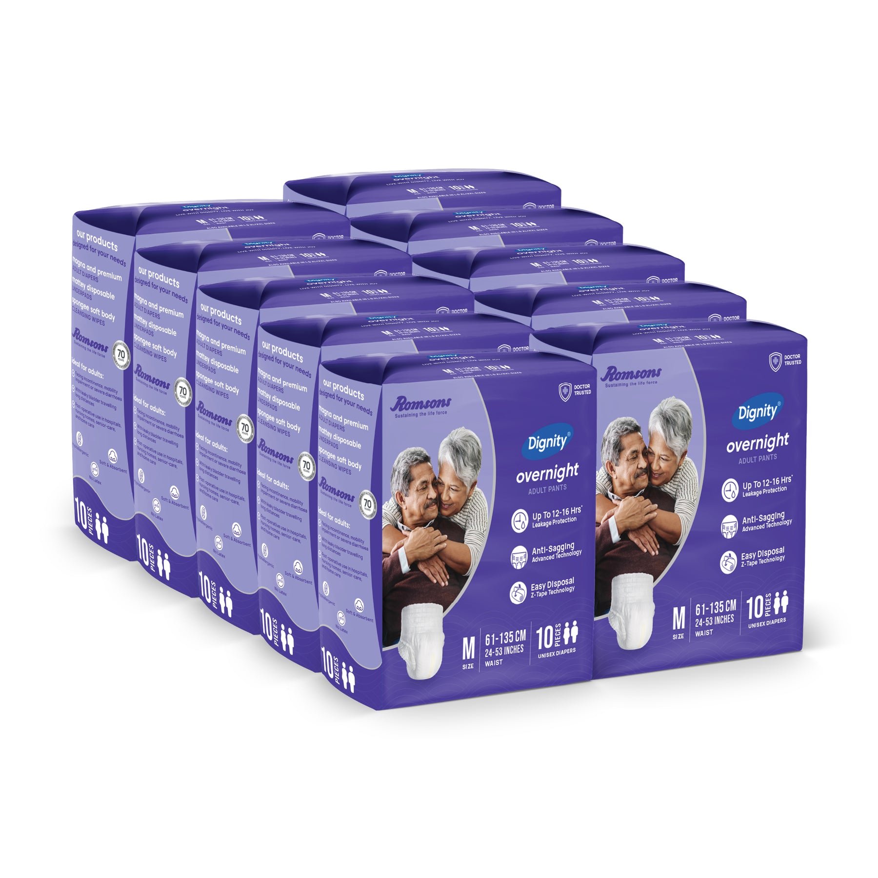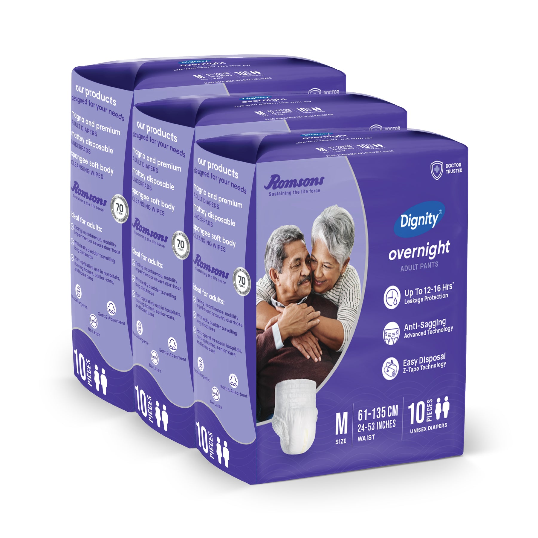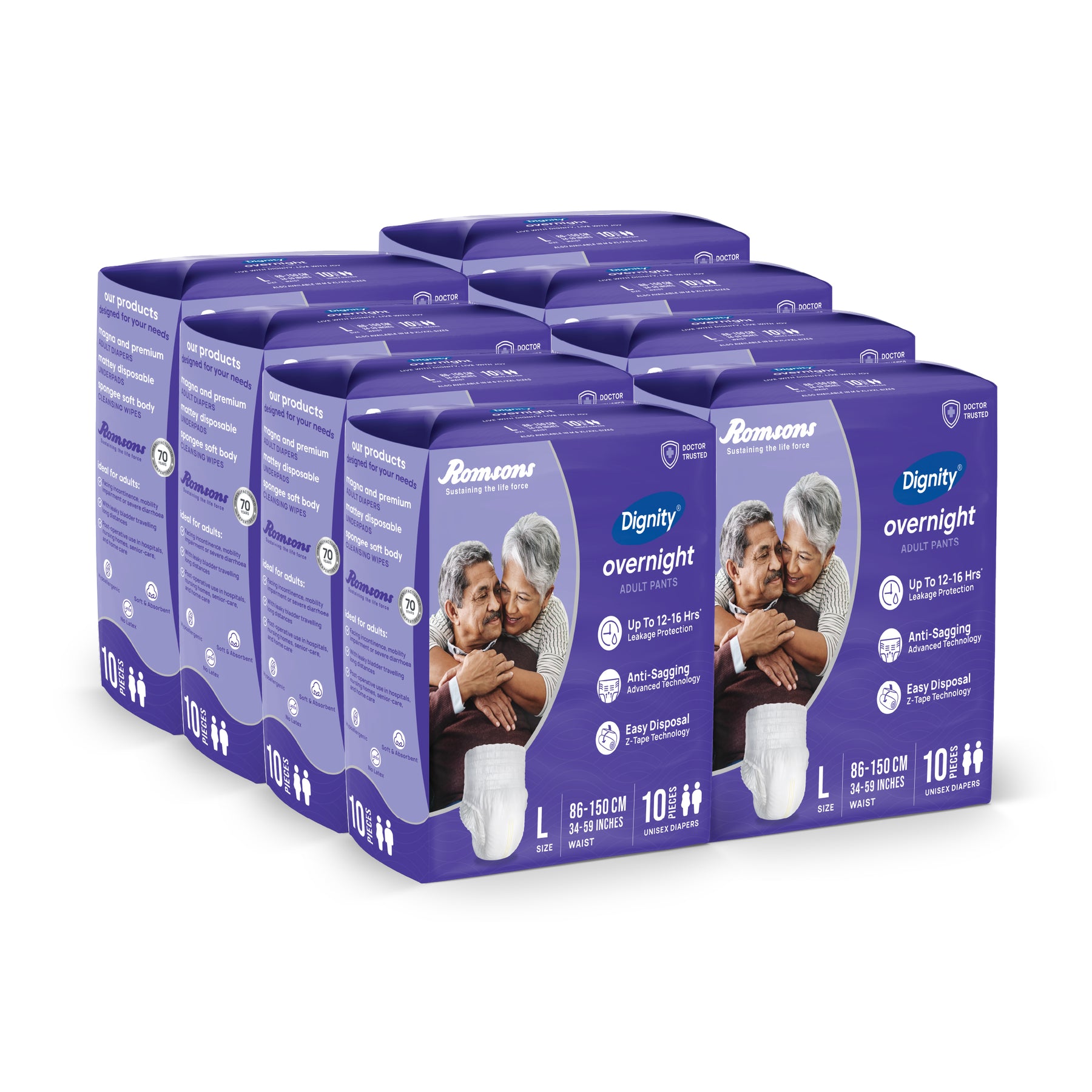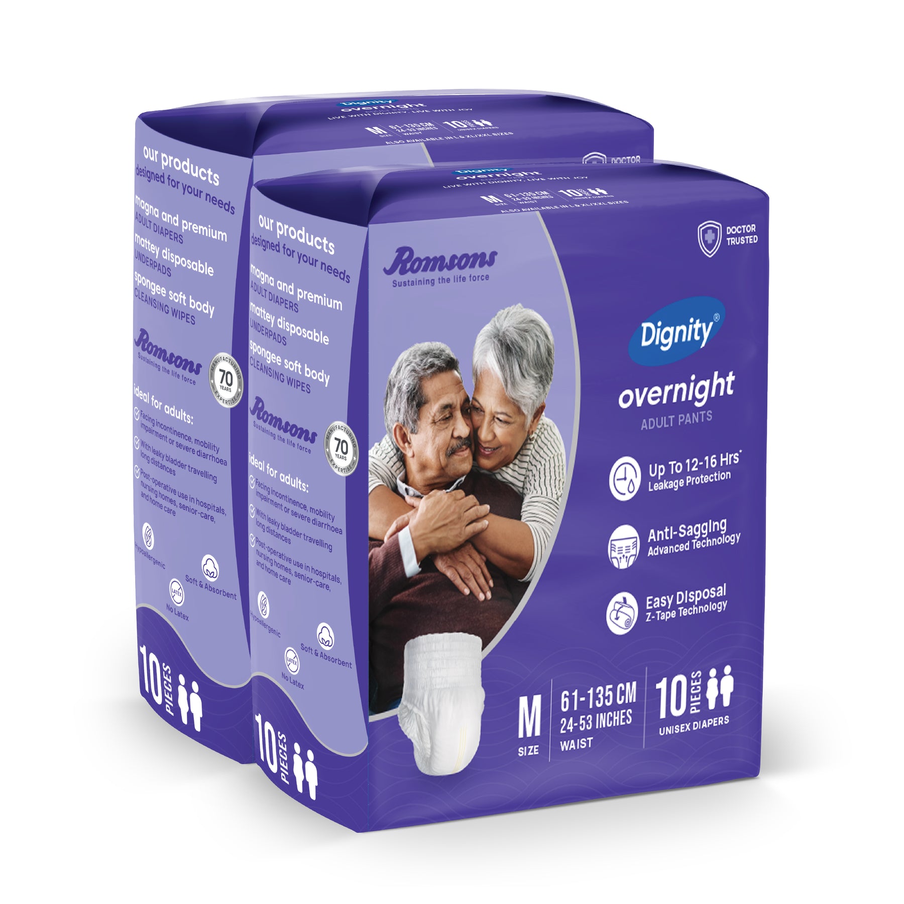 Dignity Overnight Pull-Ups are pants style adult diapers with a Leakage Protection Promise for up to 12-16 Hours. Easy to wear and take off, our Overnight Pull-Ups are designed for both men & women suffering from urinary or bowel leakage.